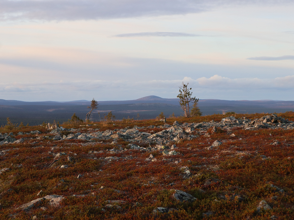 Harmittelimme myös, että olimme tuhlanneet niin paljon aikaa harharetkeen rajavyöhykkeelle. Kuskoivalla aurinko oli jo painumassa tunturin toiselle puolelle, niin että punainen rinne jäi varjoon. Suurena mattona hehkuvasta maaruskasta ei siis saatu kuvia, sen loiste kun hiipui valon vähentyessä.